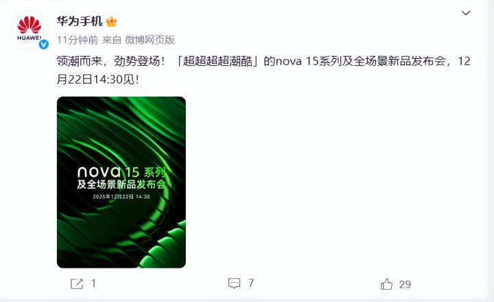 12 月 15 日,华为正式官宣 “领潮而来,劲势登场” 新品发布会, nova15 系列及全场景新品将在 12 月 22 日 14:30 亮相,同步启动全渠道预热,并将于 12 月 28 日正式开售,从预热到上市仅间隔 13 天,创下 nova 系列迭代最快开售纪录。